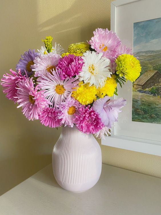 - срезанные астры эффектно сочетаются с различными цветами, от декоративных подсолнухов до похожих на астры георгинов. Идеальными "компаньонами" для астр считаются как изысканные "царственные" цветы - лилии и розы, так и растущие в скромных палисадниках ромашки и гладиолусы. Украсить букет из астр можно декоративными папоротниками, а с крупными букетными астрами превосходно сочетаются злаковые.