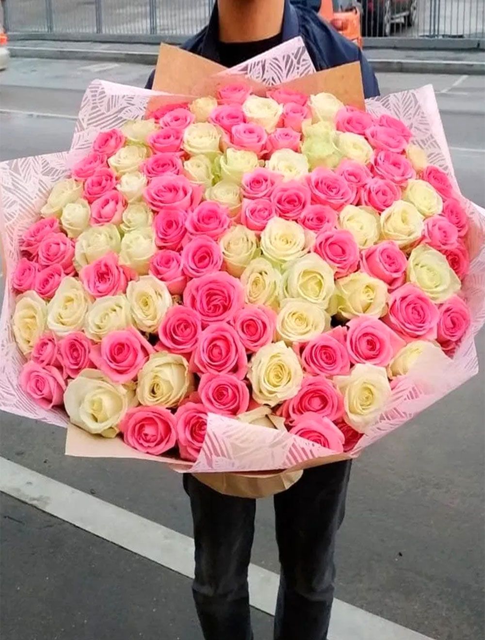 Состав: роза розовая 50 см, белая - 101 шт., упаковка, лента. -