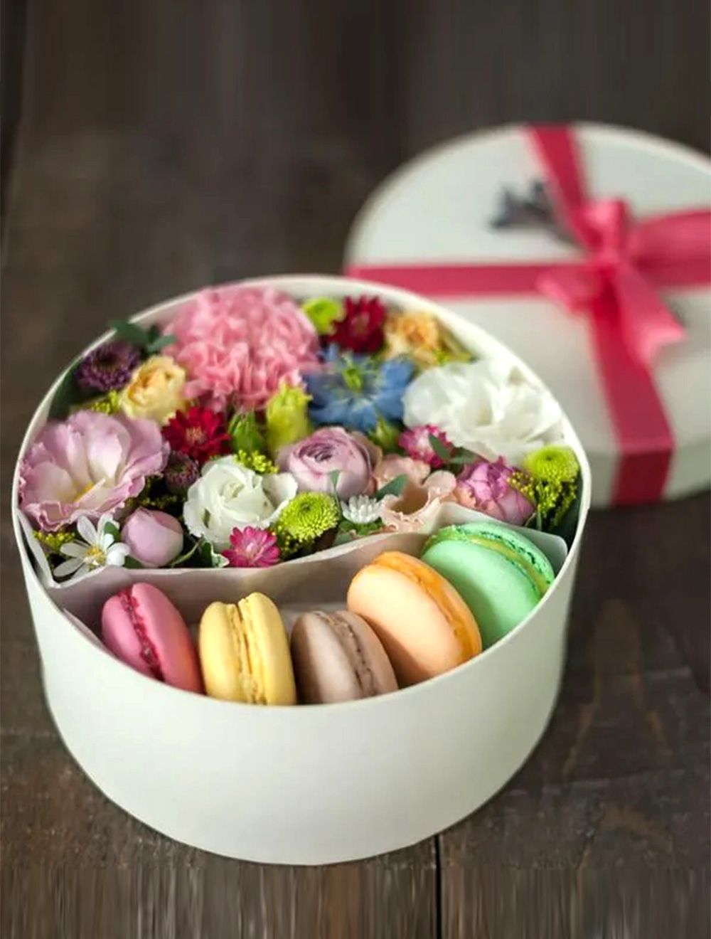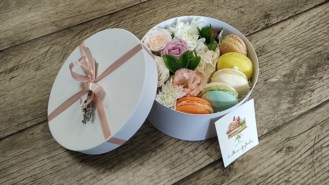 Состав: коробка в светлых тонах, макаронс - 5 шт., цветочная композиция.