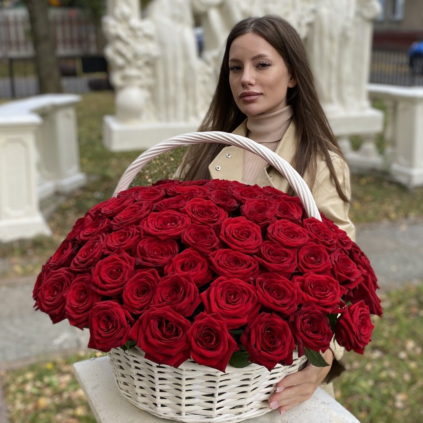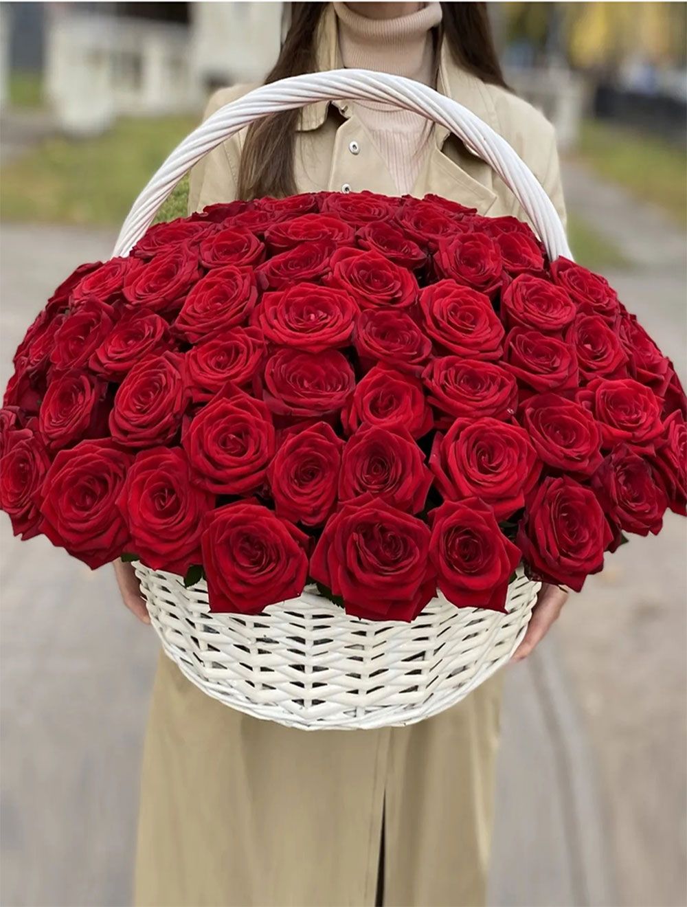 Состав: роза красная 50 см - 101 шт, корзина, упаковка, оазисная губка. -