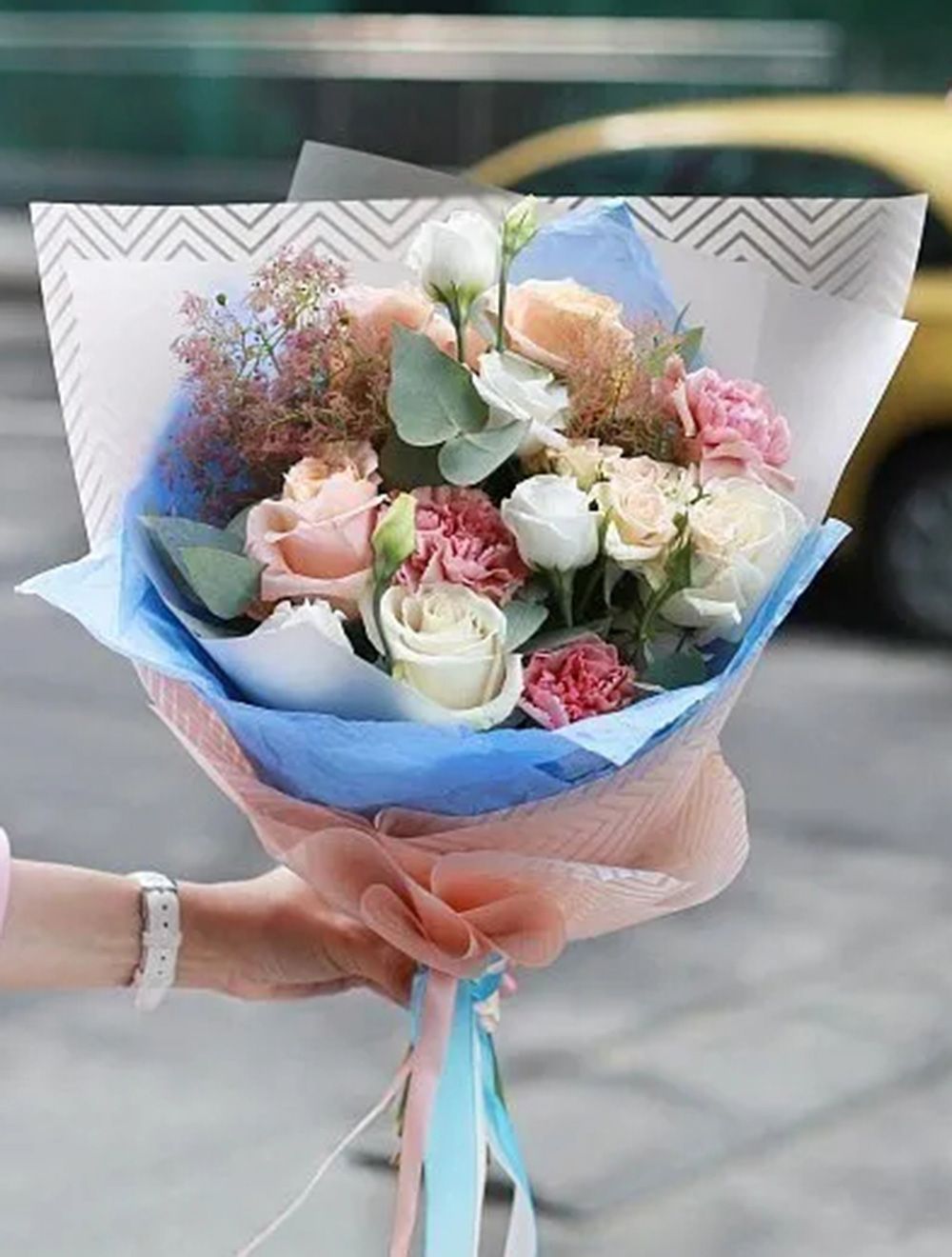 Состав: роза одноголовая 50 см - 6 шт, диантус - 3 шт., эустома, кустовая роза, декор, матовая пленка, лента Если эвкалипта не окажется в ниличии, он может быть заменен на другой подобный декор, по предварительному согласованию с Вами.