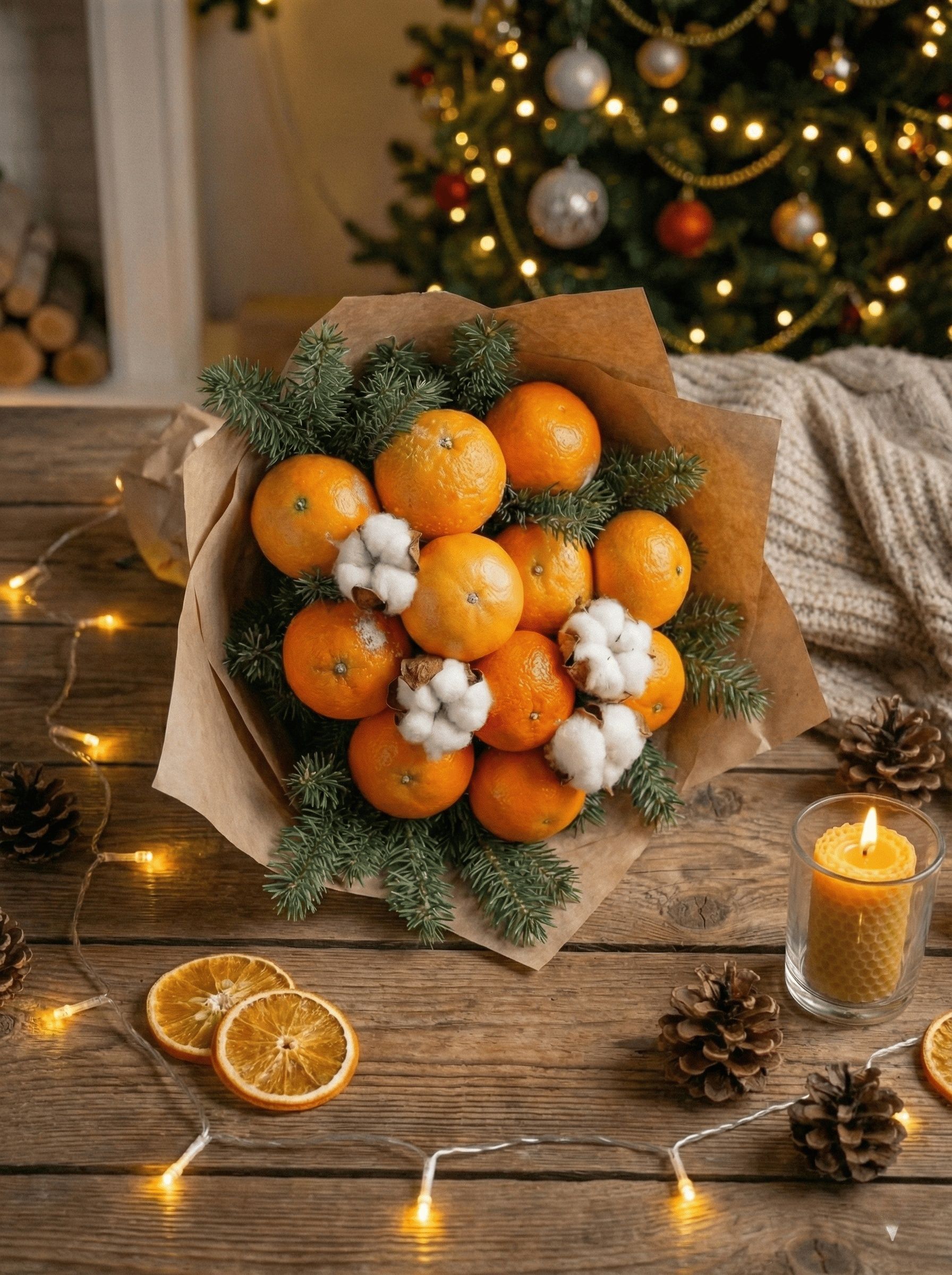 Стойкость: Лапник Нобилис не осыпается, а хлопок — сухоцвет. Когда мандарины будут съедены, хвойная основа останется украшением интерьера.