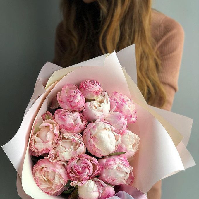 Состав: пион - 15 шт., упаковка крафт, лента. -