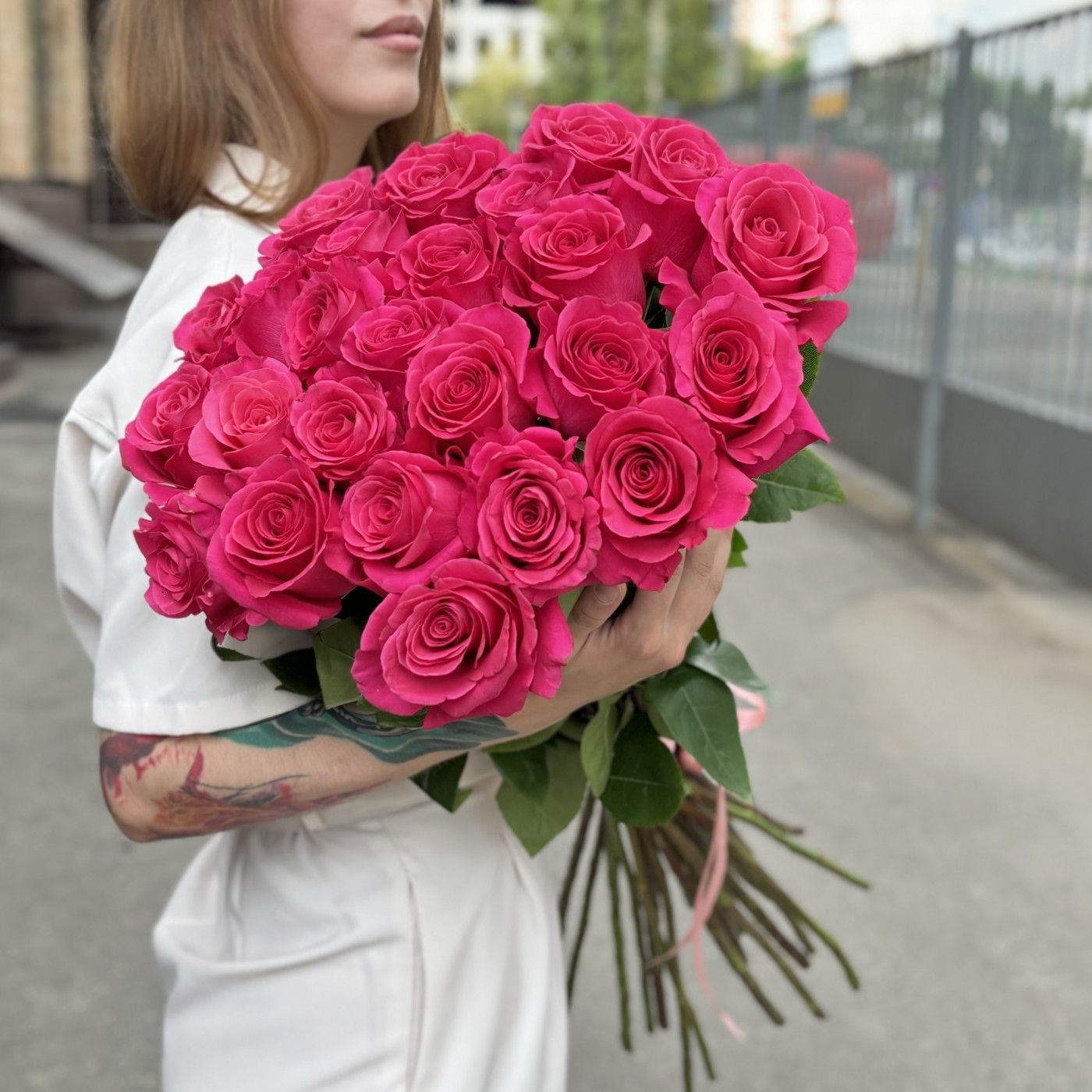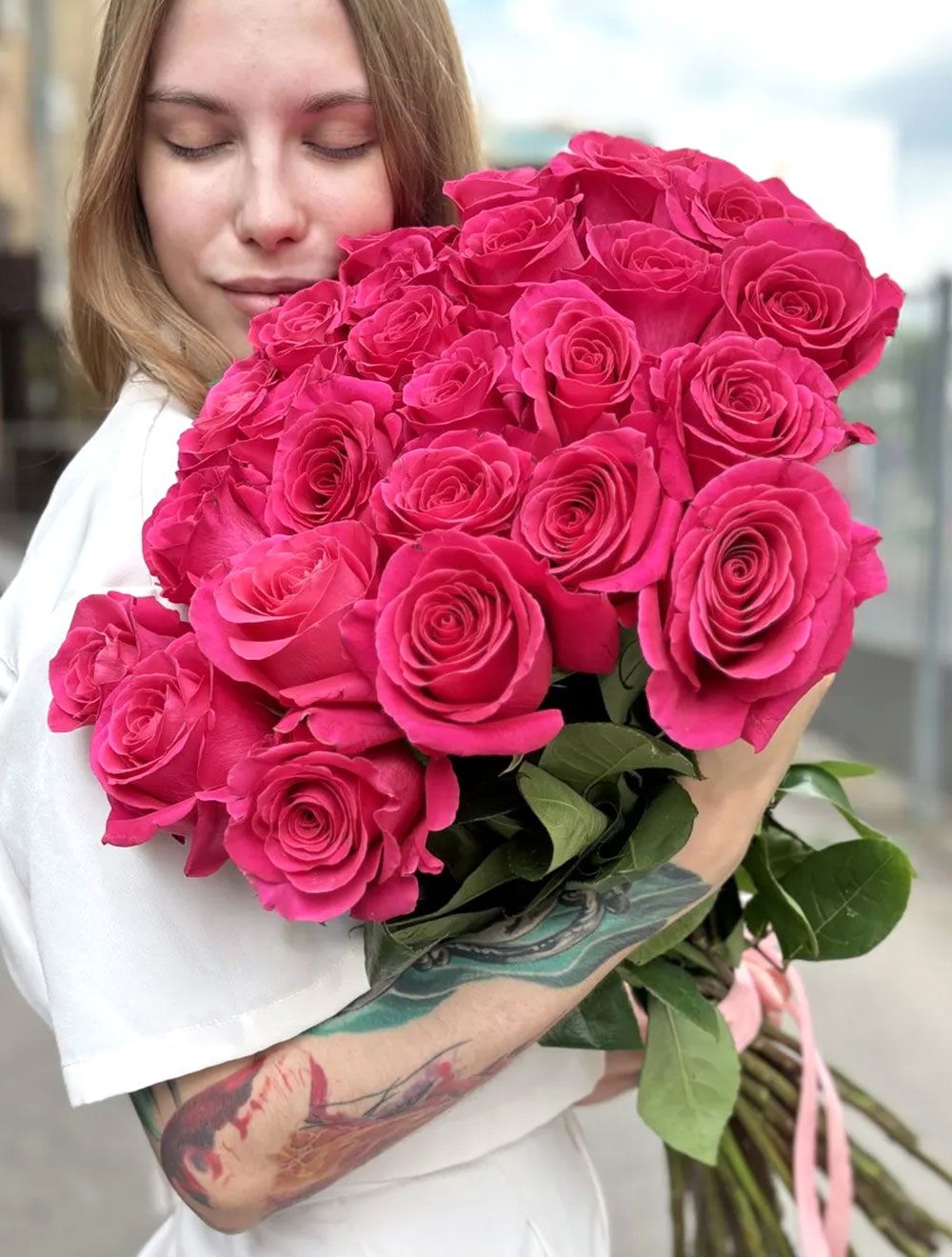 Состав: роза эквадор 80 см - 25 шт, лента. -