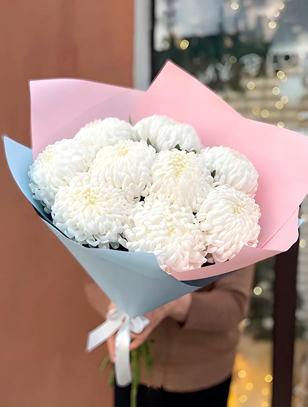 Состав: белая шарообразная хризантема - 9 шт., упаковка, лента.