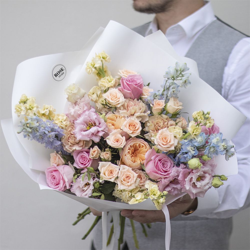 Состав: роза пионовидная - 2 шт, дельфиниум голубой - 3 шт., маттиола - 4 шт., роза кустовая - 5 шт., эустома - 2 шт., диантус сортовой - 3 шт., роза - 4 шт. Ширина: 35 см., Высота: 40 см.