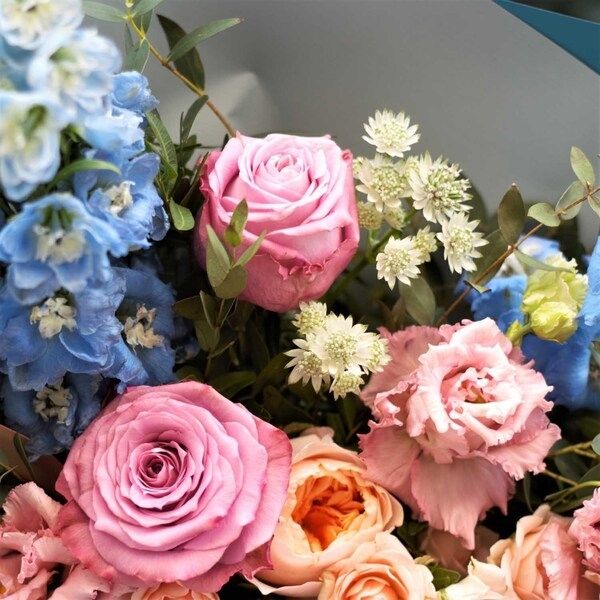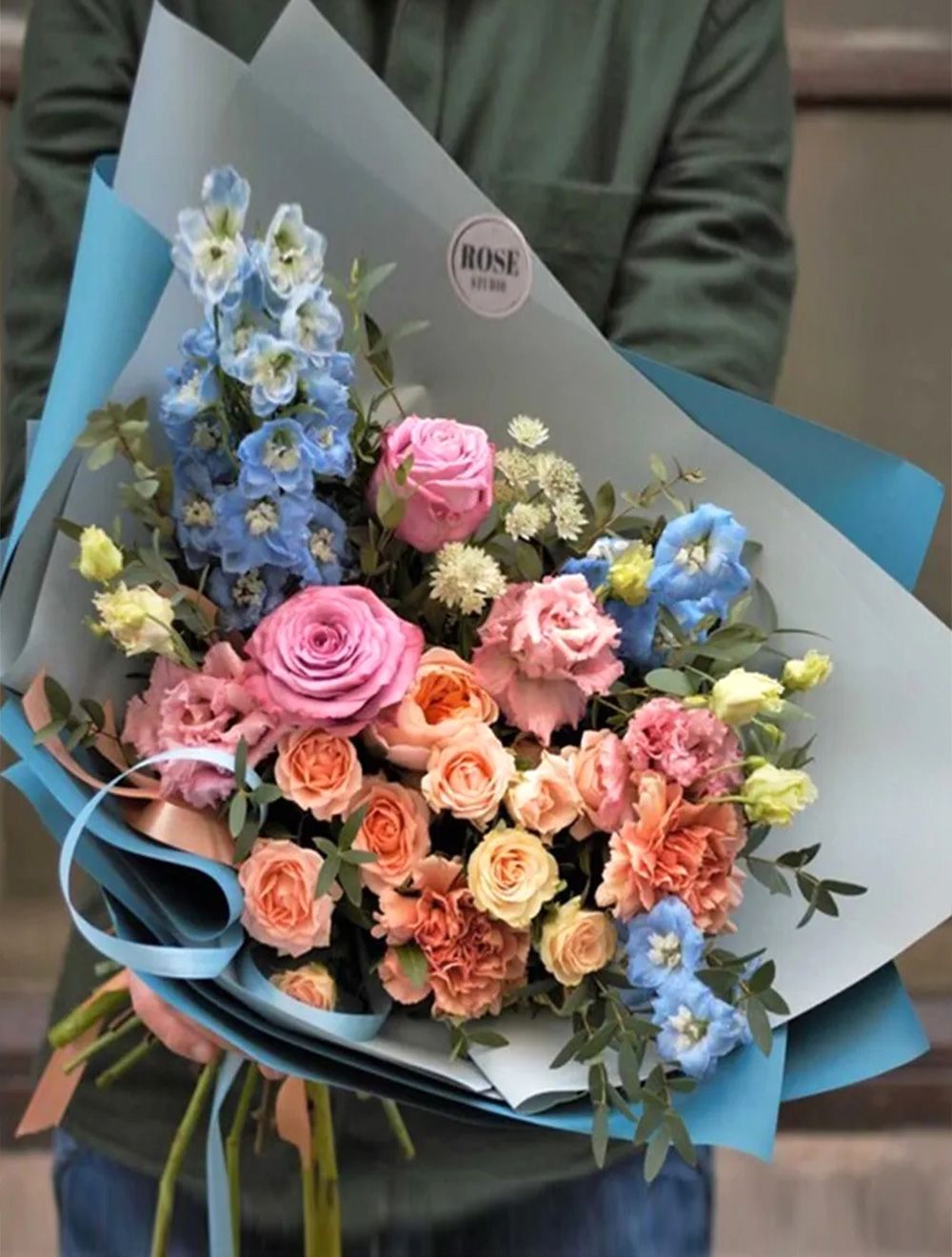 Состав: дельфиниум - 2 шт., роза пионовидная "джульетта" - 1 шт., диантус - 2 шт., роза кустовая - 3 шт., эустома алиса пинк - 2 шт., астранция - 1 шт., роза сиреневая - 2 шт., эвкалипт - 2 шт., фисташка - 1 шт., лента атласная - 1 шт., упаковка матовая - 3 шт. Ширина - 35 см., высота - 40 см.