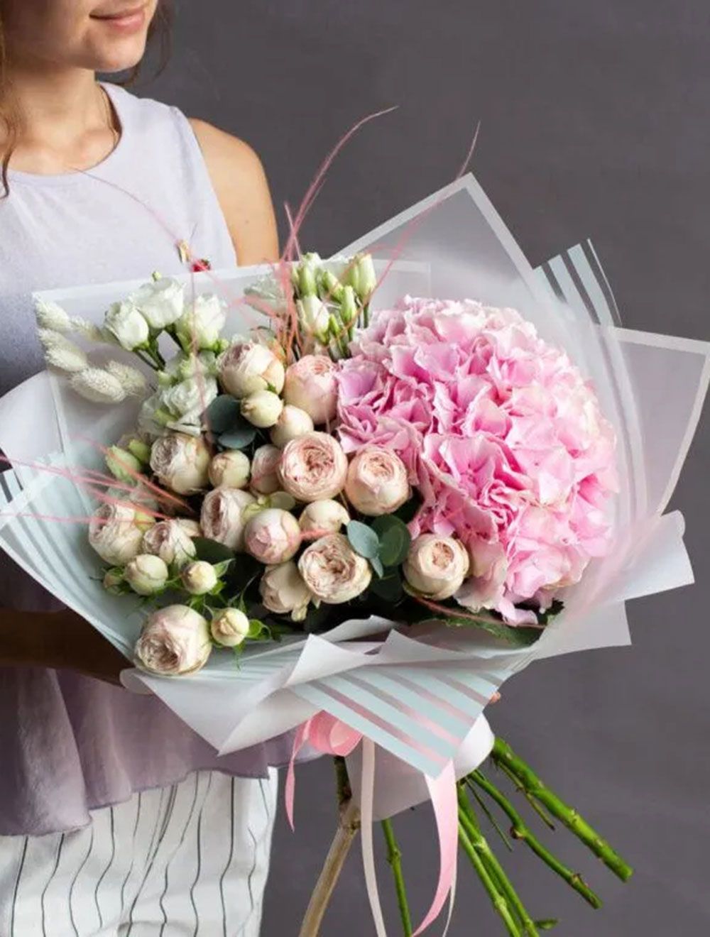 Состав: гортензия - 1 шт, пионовидная кустовая роза 50 см - 10 шт, эустома - 3 шт, зелень, оформление, лента.