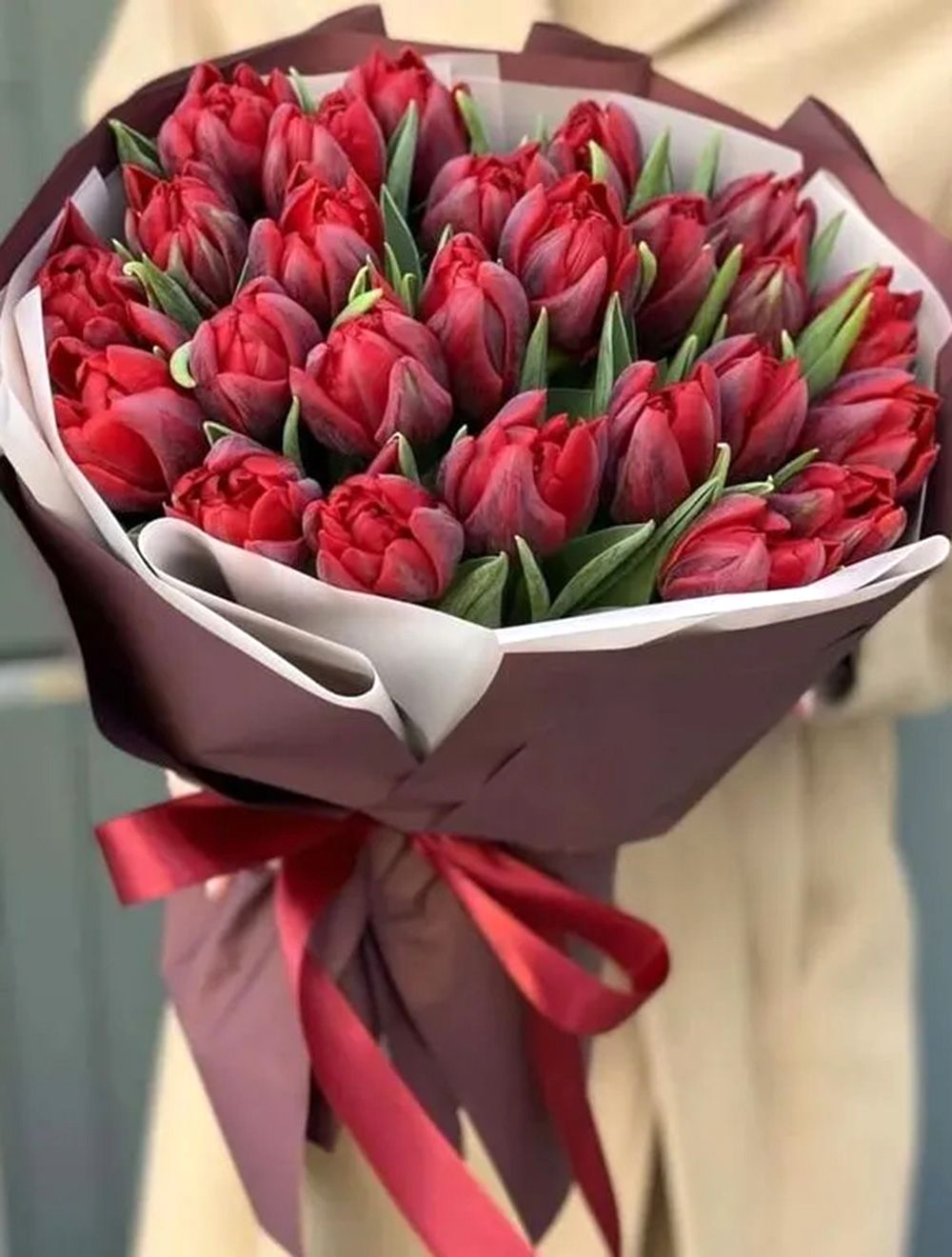 Состав: Тюльпаны пионовидные - 25шт, Оформление, Лента.