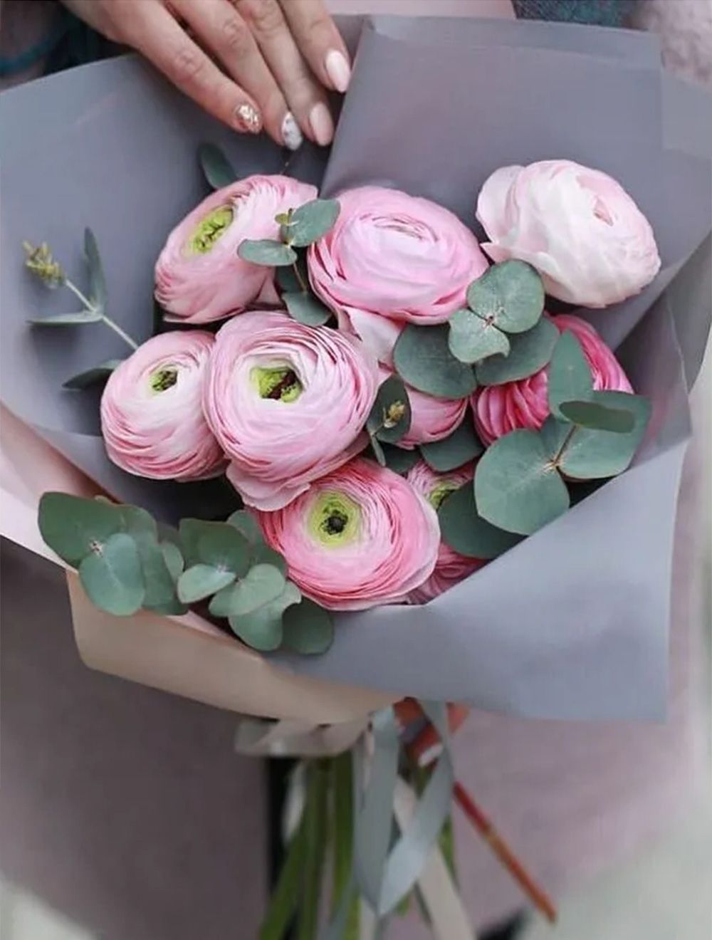 Состав: Ранунклюс - 9 шт, Зелень, Оформление, Лента.