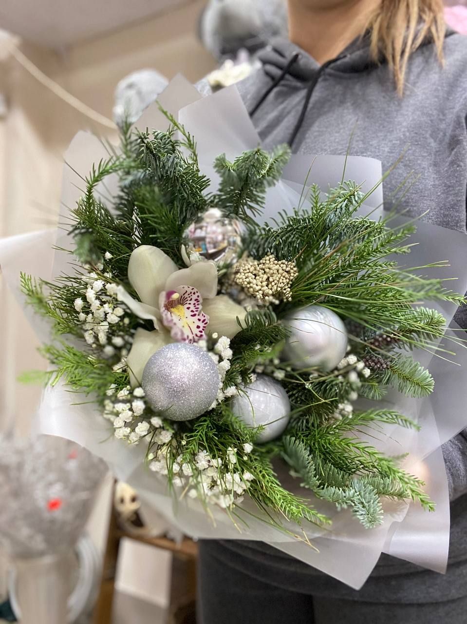 Состав: нобилис, сосна, туя, араукария, азатамус, гипсофила, шар - 4 шт, оформление.