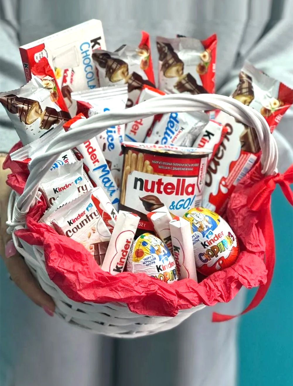 Состав: киндер сюрприз - 2 шт, киндер шоколад - 2 шт, киндер делис - 3 шт, киндер Буэно - 4 шт, киндер макси - 3 шт, киндер кантри - 3 шт, киндер нутелла - 1 шт, корзина, тишью, лента.