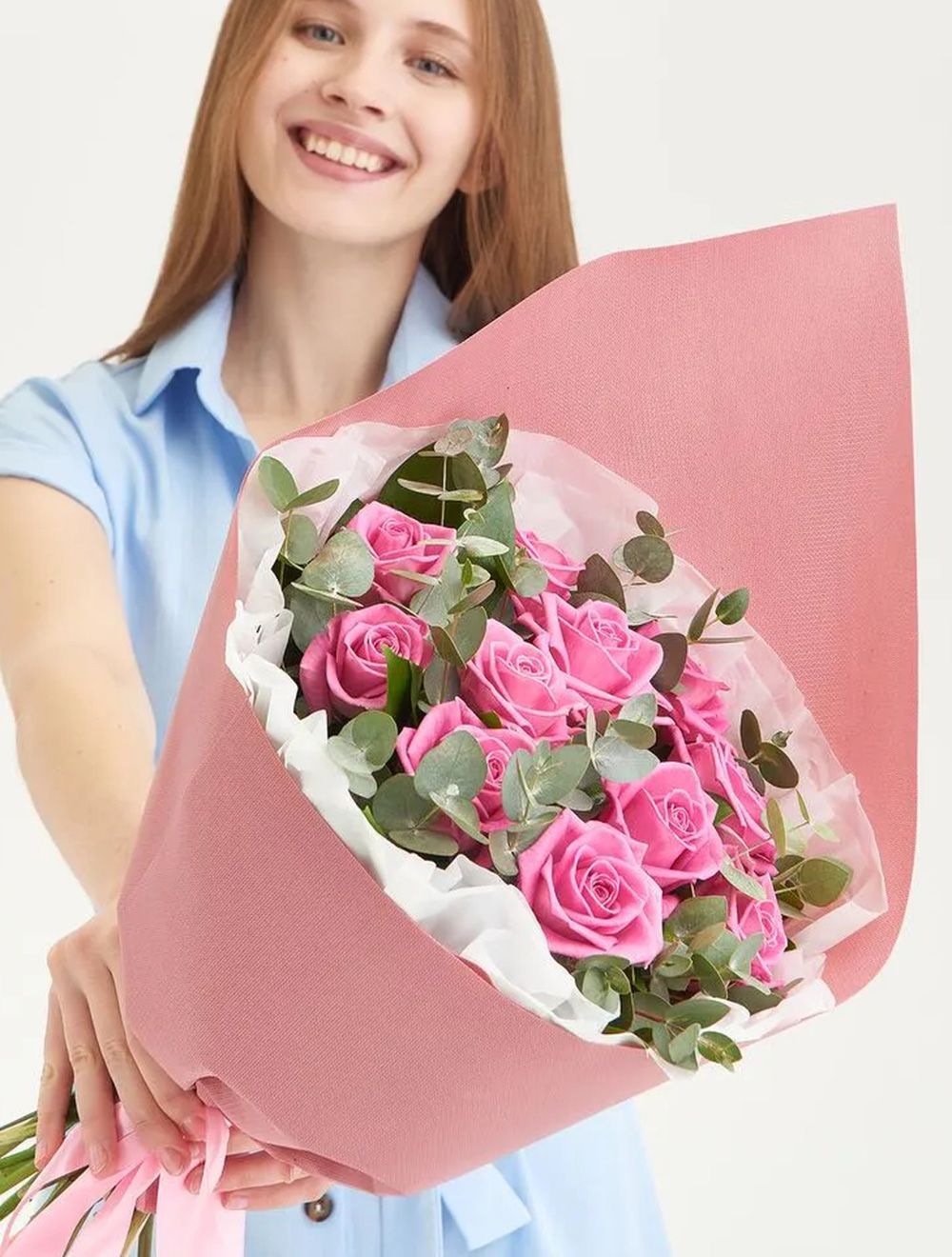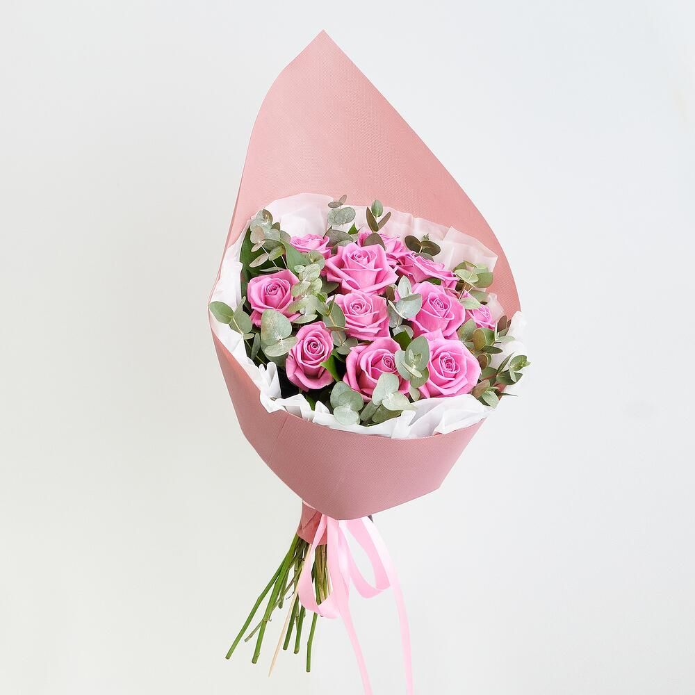 Состав: роза розовая 50 см - 11 шт, эвкалипт - 2 шт, крафт, лента. -