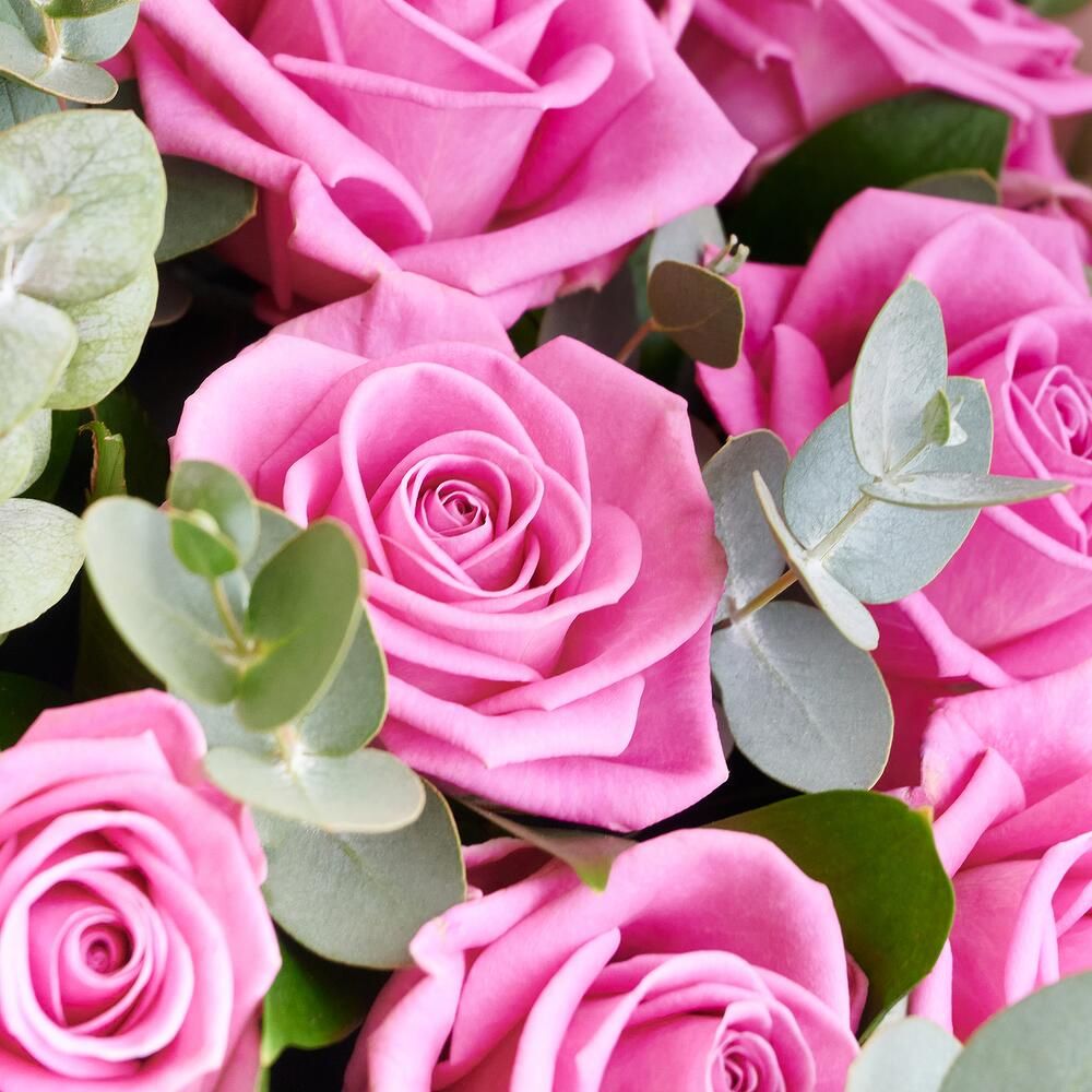 Состав: роза розовая 50 см - 11 шт, эвкалипт - 2 шт, крафт, лента.