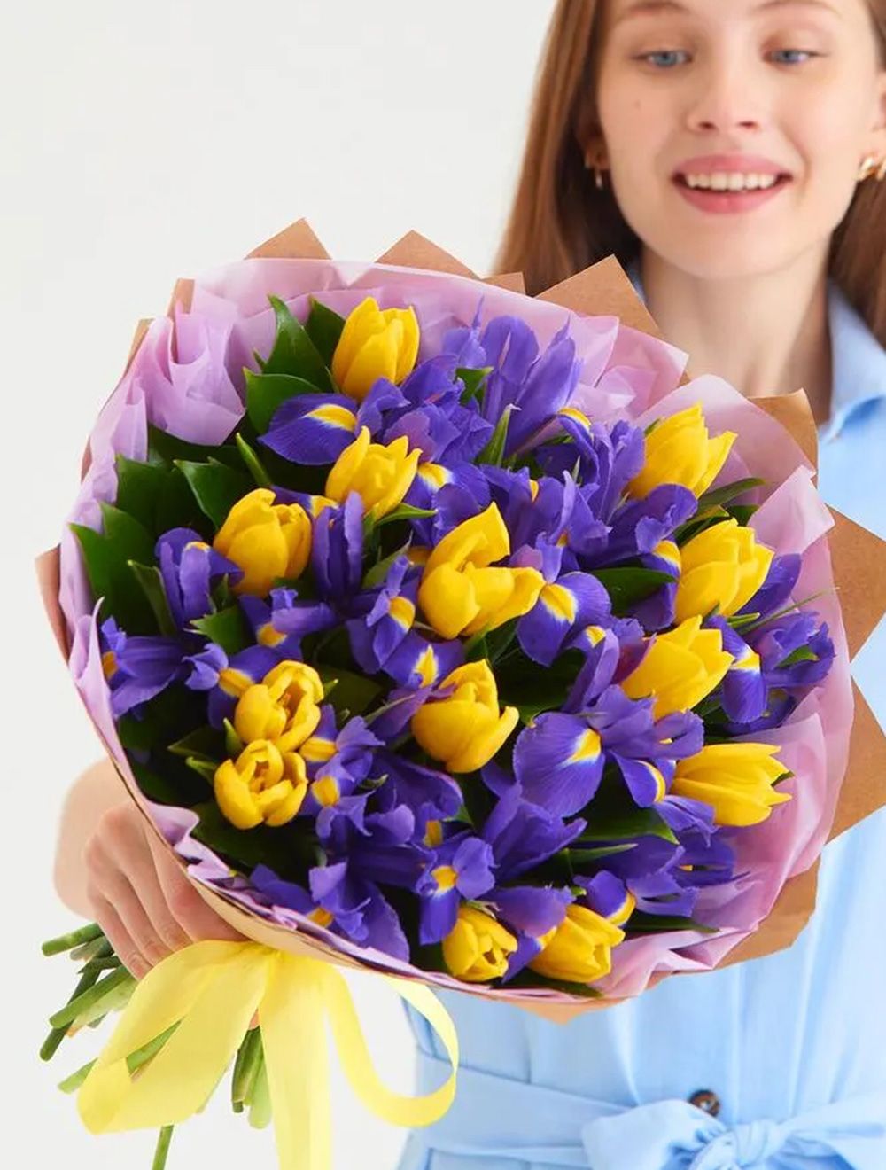Состав: тюльпан желтый - 13 шт, ирис - 12 шт, салал, оформление, лента.