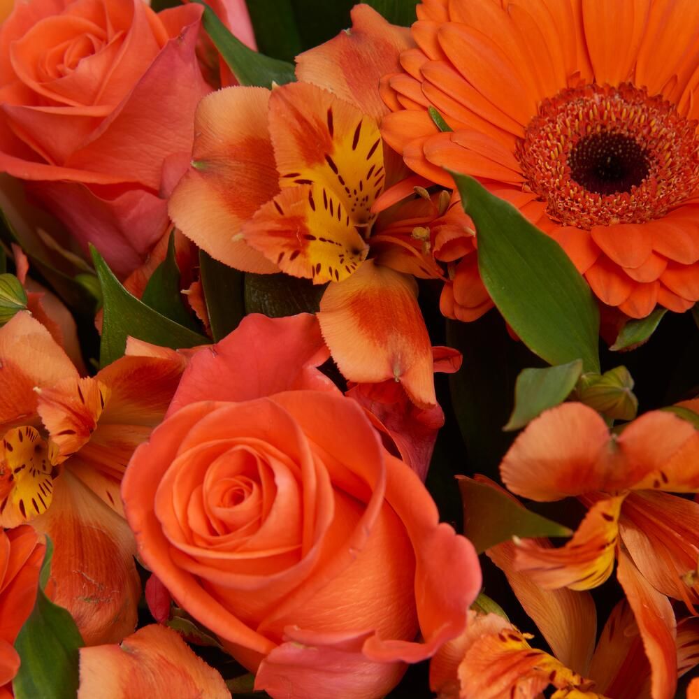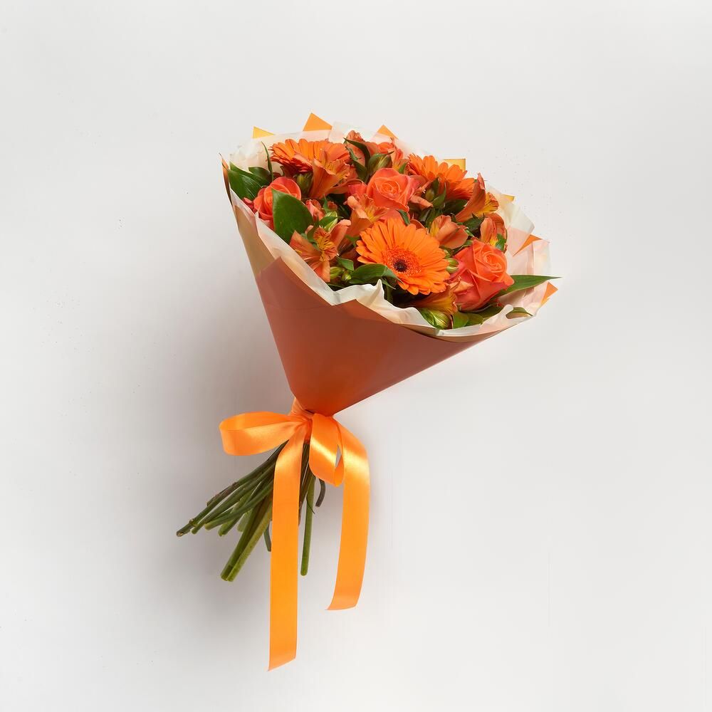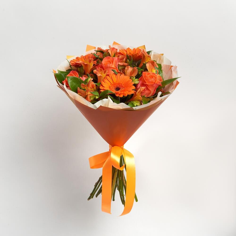 Состав: альстромерия оранжевая - 3 шт, гербера оранжевая - 3 шт, роза оранжевая 50 см - 4 шт, зелень, упаковка, лента.