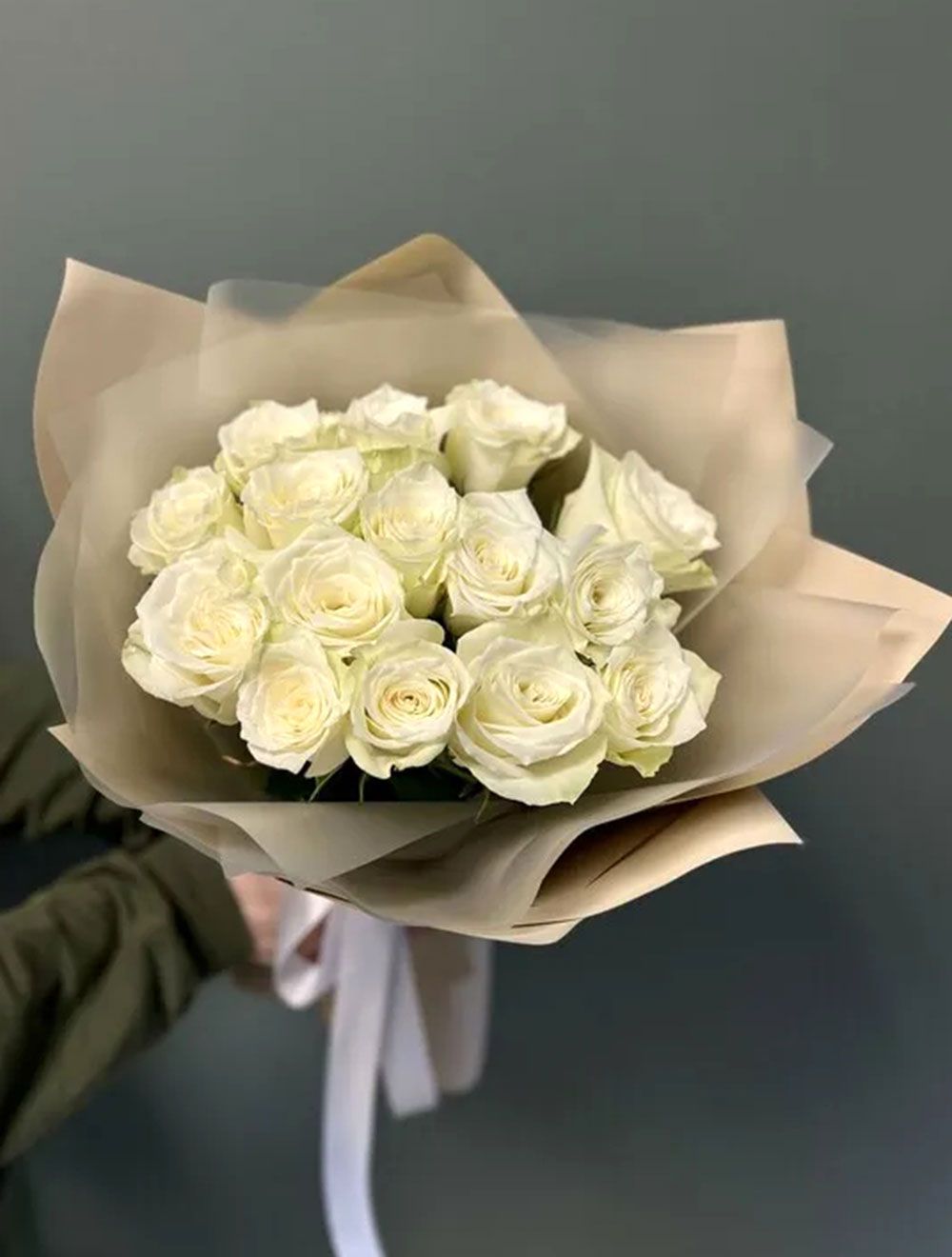 Состав: роза белая 50 см - 15 шт, упаковка - 1 шт., лента - 1 шт.