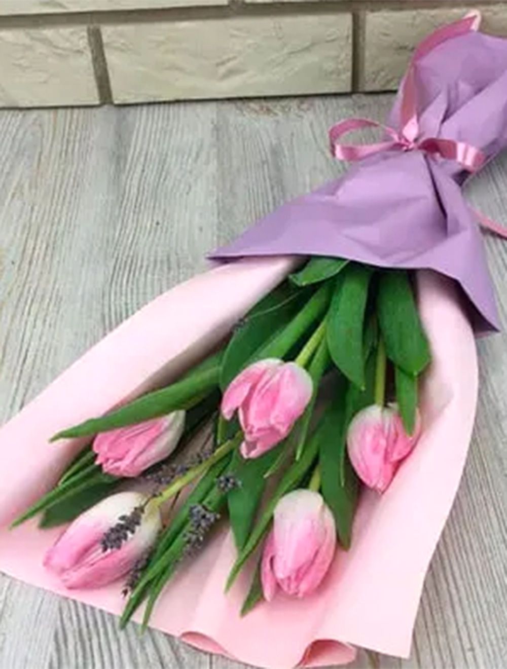 Состав: тюльпан розовый - 5 шт, упаковка, веточка лаванды, лента.