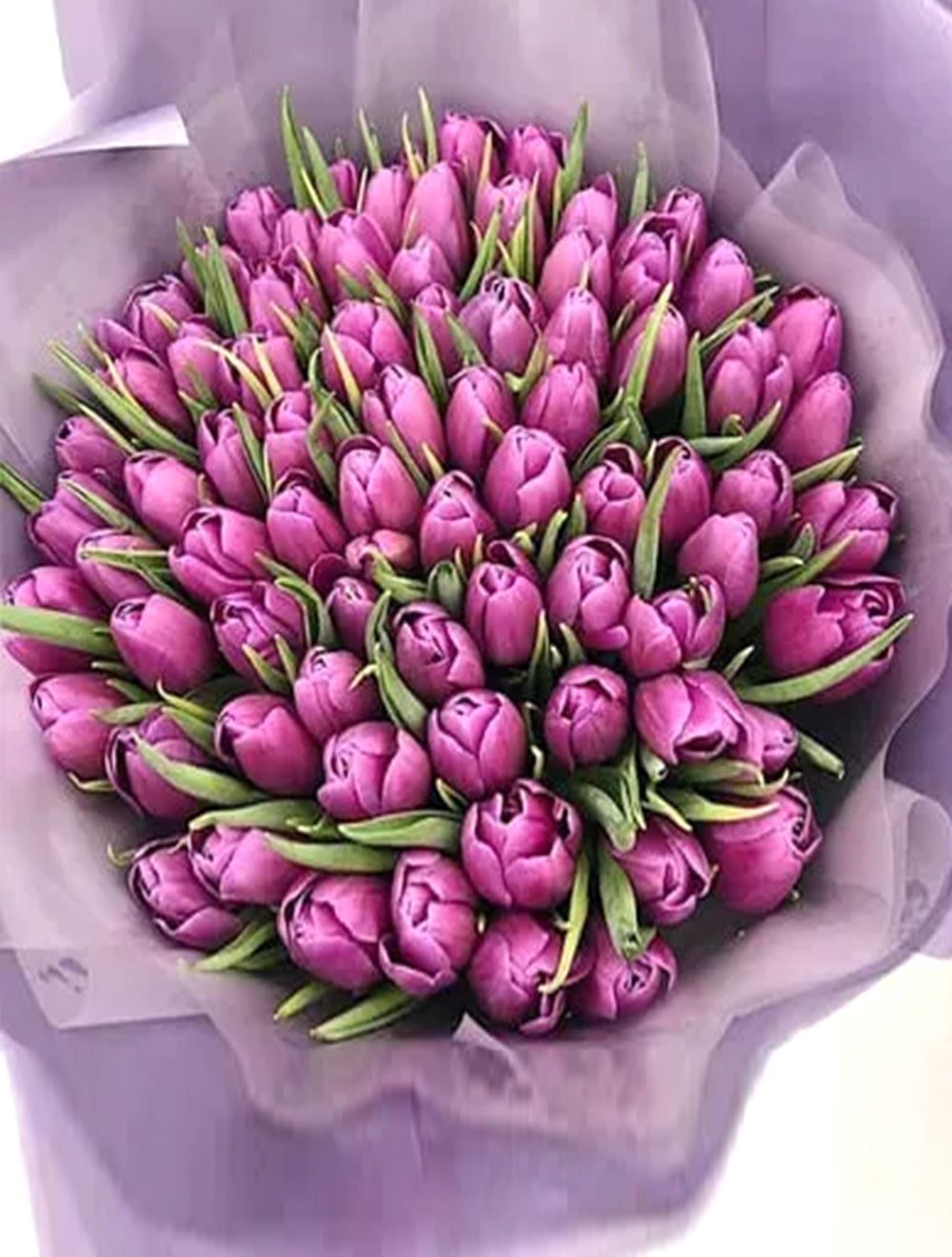 ТипбукетВысота40 смДиаметр55 смВид цветовтюльпанЦветфиолетовыйКоличество101 шт.Упаковкапленка