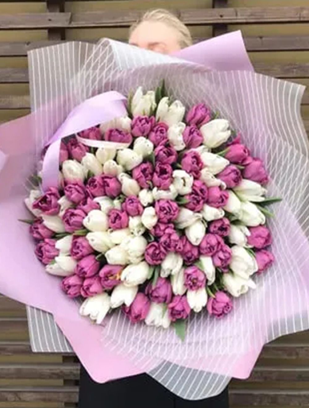 Состав: тюльпан розовый микс - 101 шт, упаковка, лента.