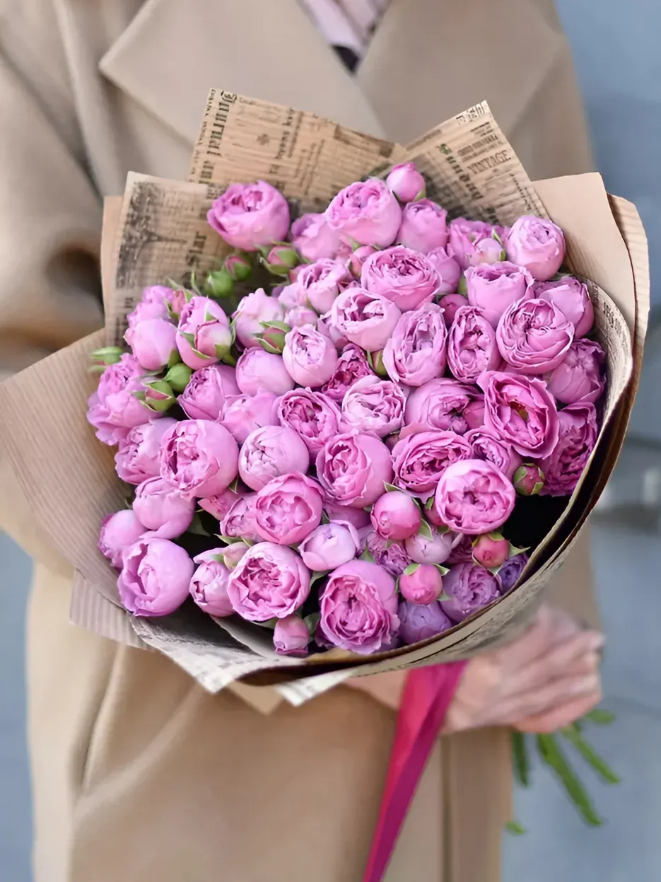 ТипбукетВид цветовпионовидная розаЦветрозовыйКоличество13 шт.Упаковкакрафт