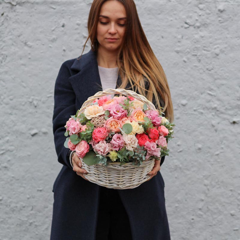 Состав корзины может немного изменяться в зависимости от сезонности и наличия цветов.Букет будет по ценности и цветовой гамме абсолютно идентичный.