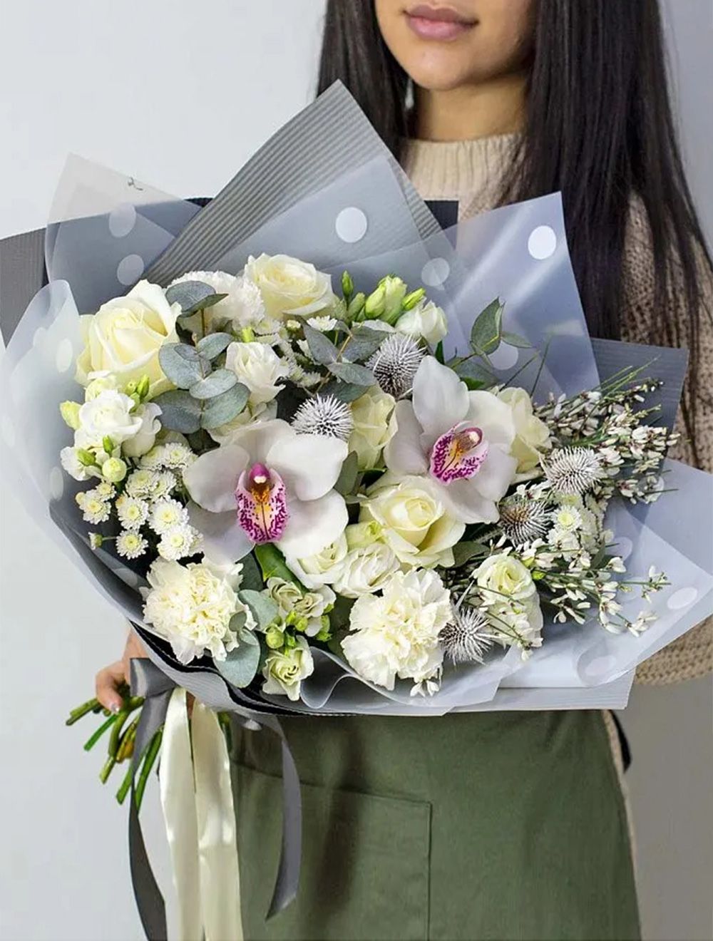 Состав: э устома белая - 5 веток, ц имбидиум белый - 2 шт, г воздика белая - 3 шт, гениста белая - 2 ветки, роза 50 см - 5 шт, хризантема кустовая - 2 ветки, ирингиум - 5 шт, э вкалипт - 5 веток.