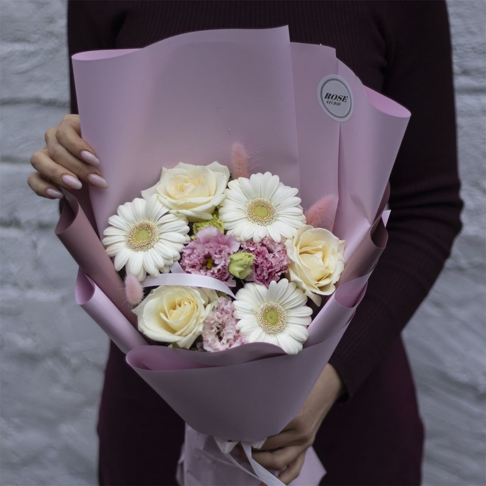 Состав: гермини - 3шт, роза белая - 3шт., эустома - 1шт, лагурус - 3шт., фисташка - 1шт. Ширина - 27 см., высота - 40 см. -