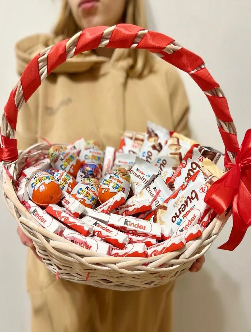 Состав: киндер сюрприз - 7 шт, киндер шоколад - 24 шт, киндер Буэно - 5 шт, киндер шоколад со злаками - 3 шт, корзина, лента.