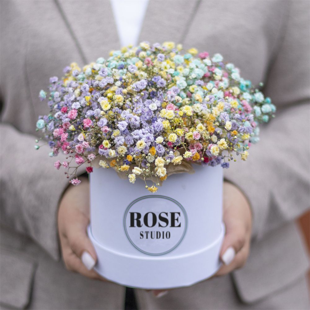 Состав: гипсофила радужная - 5 шт., коробка шляпная - 1 шт. Ширина - 20 см., высота - 20 см. -